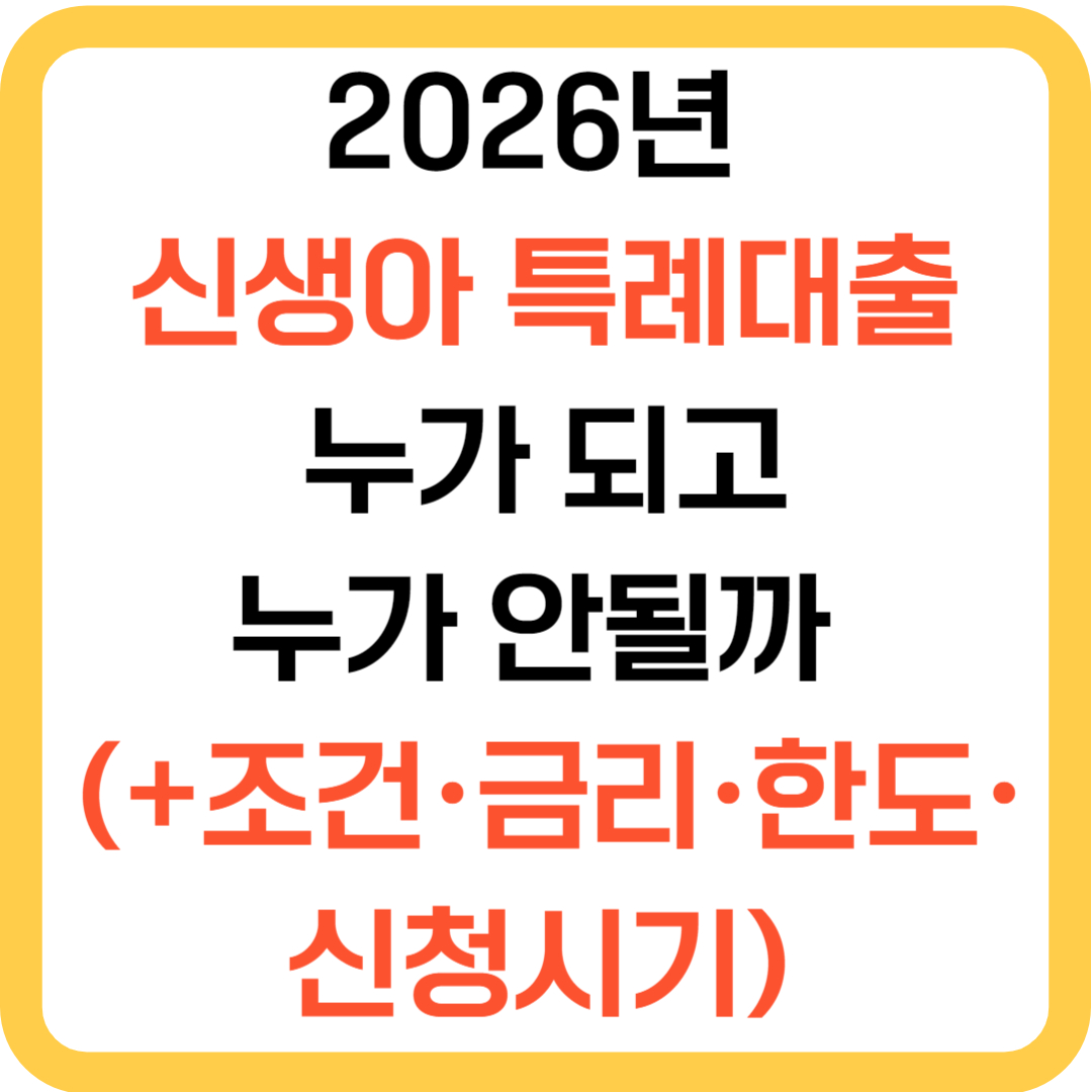 신생아 특례대출은 출산 또는 입양 가구를 대상으로 한 정부 주거 지원 정책입니다.시중 대출보다 규제가 적고 금리가 안정적인 것이 가장 큰 장점인데요.주택 구입, 전세 자금, 대환까지 가능하기 때문에 출산이나 입양을 계획 중이시거나, 이미 아이를 둔 가구라면 기존 조건과 2026년 바뀐 내용들을 꼭 숙지하셔야 합니다. 2026년 기준 출산·소득·자산 요건순자산: 5.11억 원 이하 출산 요건: 출산·입양 후 2년 이내 (임신 중 신청불가)소득:합산 1.3억 원맞벌이 최대 2억 원단, 개인 소득 1.3억 초과 불가대출 한도와 규제 구조구입: 최대 4억 원전세: 최대 2.4억 원LTV 70~80%DTI 60% 이내규제지역 차등 적용금리와 특례 연장 구조기본 금리: 1.8% ~ 4.5%특례 기간: 5년추가 출산..