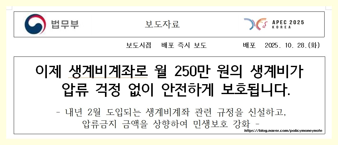 통장이 갑자기 묶여 생활비조차 쓰지 못하는 상황,막연한 이야기 같지만 실제로 많은 분들이 겪고 있는 현실입니다.이런 문제를 해결하기 위해 정부가 2026년 2월부터 ‘생계비계좌’ 제도를 도입합니다.월 250만 원까지 압류가 전면 금지되는 계좌로,채무자의 최소한의 생계를 실질적으로 보호하겠다는 취지입니다.이번 글에서는 생계비계좌가 왜 만들어졌는지, 기존 제도와 무엇이 달라지는지,그리고 실제 생활에서 어떻게 달라질지까지 알려드리겠습니다.생계비계좌, 왜 필요했을까사실 지금도 ‘압류금지 생계비’ 제도는 존재합니다.그동안은 월 185만 원까지의 예금은 법적으로 압류가 금지되어 있었죠.문제는 현실이었습니다.은행들은 다른 금융기관의 예금 현황을 알 수 없기 때문에채권자가 압류를 신청하면 일단 계좌 전체가 동결되는 경..