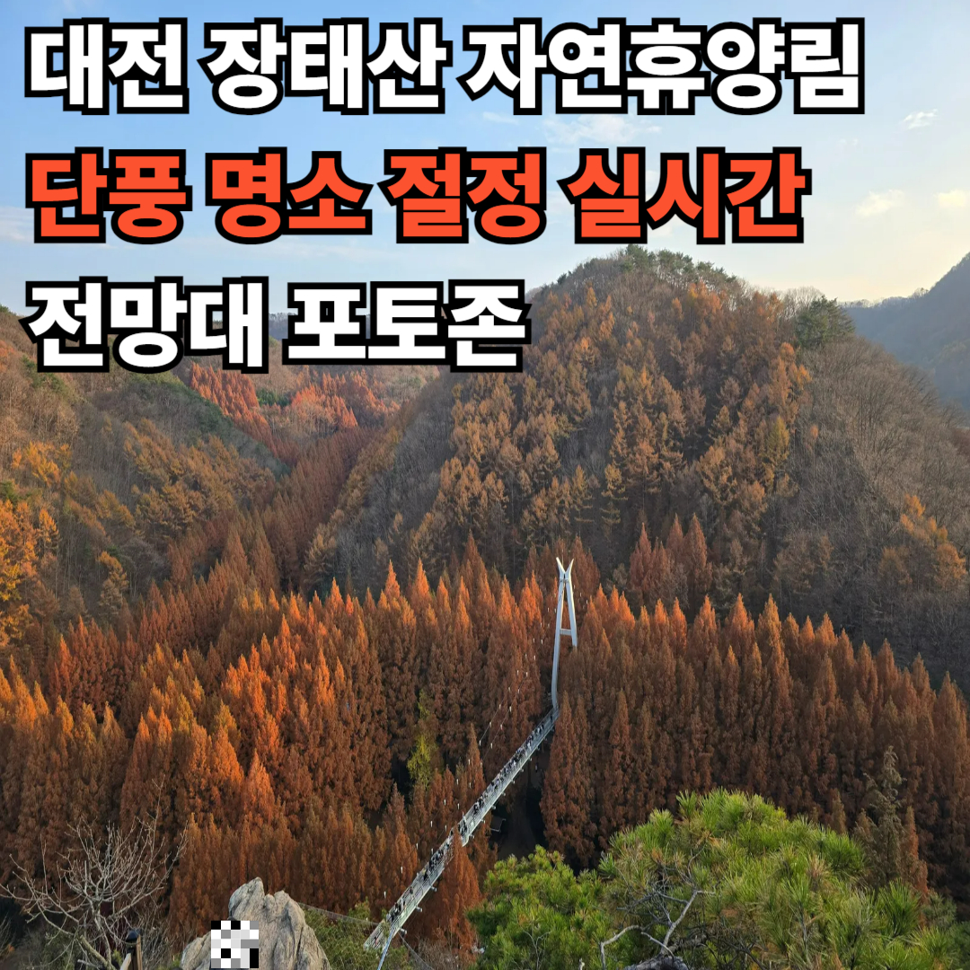 대전 장태산 자연휴양림은 매년 가을이면 ‘단풍 명소’라는 타이틀을 당당히 거머쥐는 곳입니다.특히 11월에 방문하면 입구부터 깊은 숲속까지 이어지는 단풍 터널을 제대로 즐길 수 있어 국내 가을 여행지로 꾸준히 사랑받고 있죠.제가 방문한 11월 23일 기준, 입구에 들어서는 순간부터 울긋불긋한 가을색이 한가득 펼쳐졌습니다.기온은 다소 쌀쌀했지만 햇볕이 드는 시간대라 산책하기 좋은 날씨였고, 특히 단풍 색감이 가장 깊고 선명할 시기라 사진을 찍는내내 감탄이 나올 정도였습니다.장태산 자연휴양림이 다른 단풍 명소와 차별되는 점은 걷는 내내 뷰가 끊기지 않는다는 것.중간 중간 숲속 체험 공간, 데크길, 메타세쿼이아길까지 이어져 가을을 충분히 만끽할 수 있습니다.늦가을 감성의 완성, 장태산 자연휴양림장태산을 대표하는..