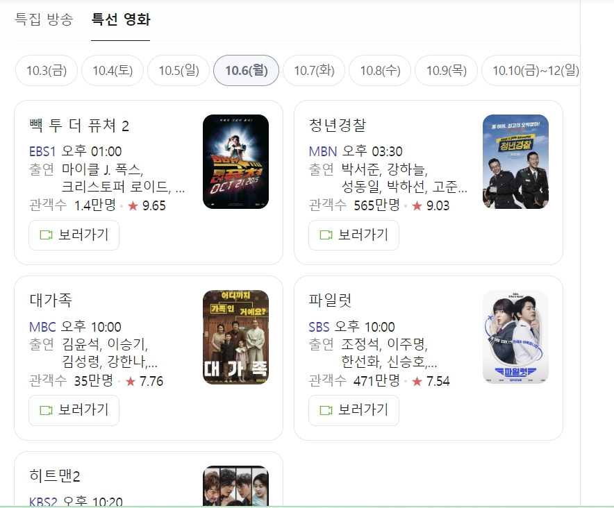 드디어 기다리던 2025 추석 황금연휴가 시작됩니다!올해는 10월 3일(금) 개천절부터 10월 9일(목) 한글날까지 이어지는 긴 연휴 덕분에,TV에서도 다양한 장르의 추석 특선영화가 풍성하게 편성되었어요.가족과 함께 감동을, 연인과 함께 웃음을, 혼자서도 몰입감 넘치는 시간을 즐기기 딱 좋은 시기죠.공식 방송사 편성표 기준으로, 날짜별·방송사별 특선영화 라인업을 정리했습니다.(※ 방송사는 편성 사정에 따라 변동될 수 있습니다)10월 3일 (금) – 추석 연휴 시작일가볍게 웃으며 연휴의 문을 여는 첫날!가족, 연인, 친구 모두 함께 보기 좋은 라인업이네요12:10 / KBS1 — 멍뭉이20:45 / tvN — 소방관22:00 / KBS2 — 조용필, 이 순간을 영원히 (음악 다큐 스페셜)22:45 /..