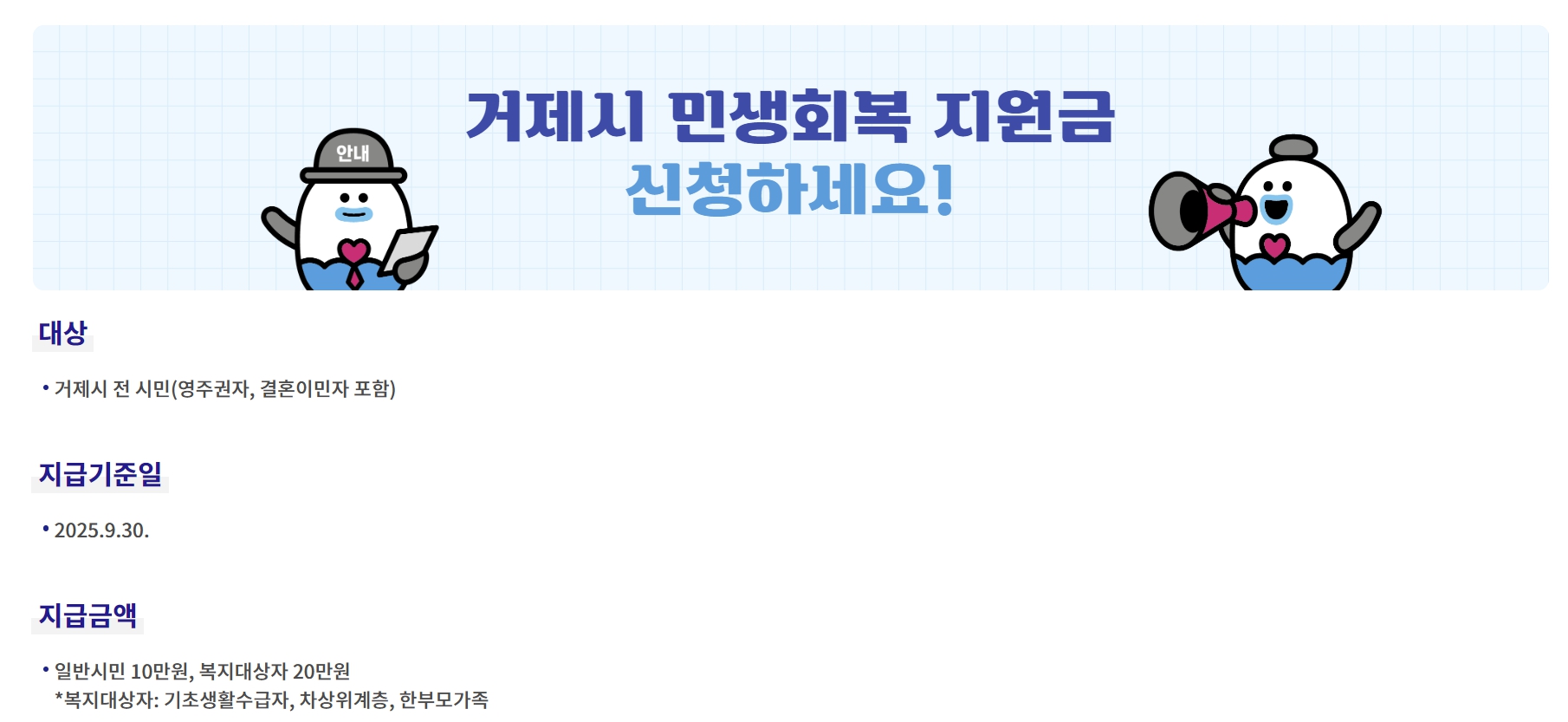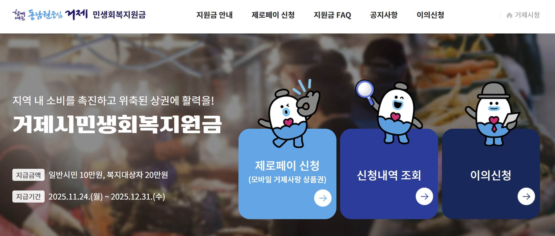 주민등록이 거제에 되어 있다면, 누구나 신청 자격이 있고 일반 시민은 10만 원, 복지 대상자는 20만 원을 지급 받을 수 있습니다.