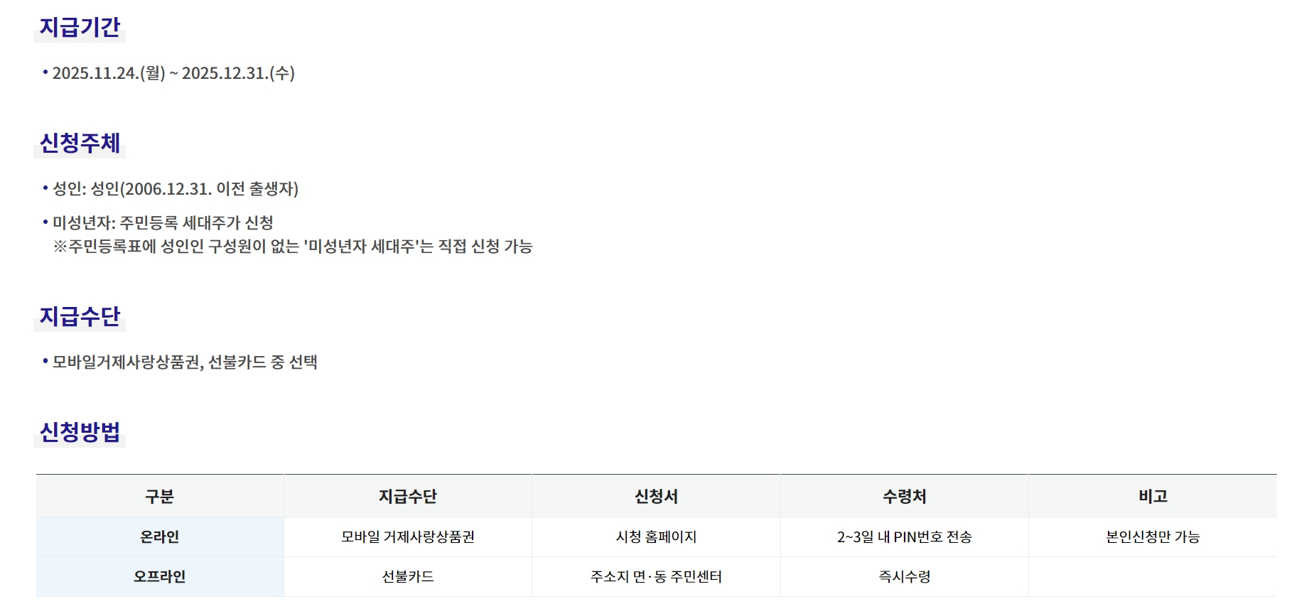 - 지급 기준일은 2025년 9월 30일. 이 날짜 기준으로 주민등록이 되어 있거나, 체류지 등록된 영주권자(F5) 및 결혼이민자(F6)도 포함됩니다.
