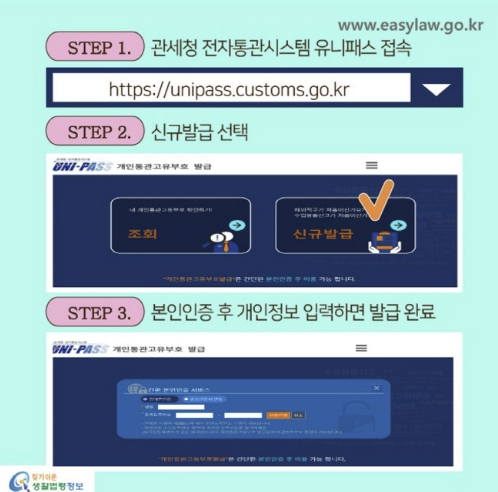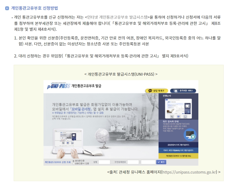 검색창에 관세청 개인통관부호 또는 유니패스(UNI-PASS) 검색 → 개인통관고유부호 메뉴 선택.