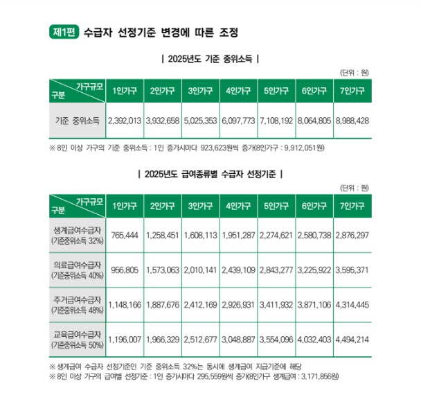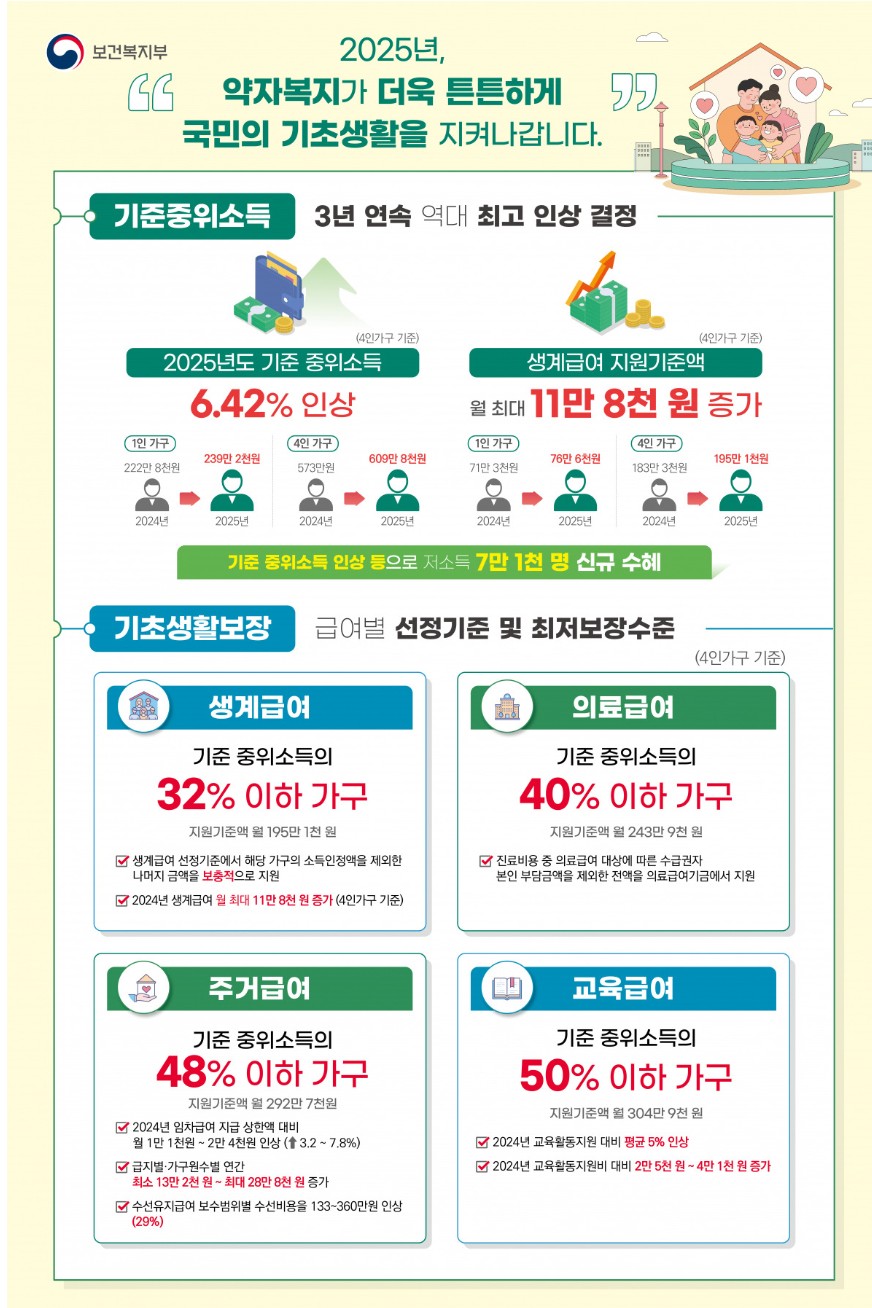 2025년 기준 중위소득은 전년 대비 6.42% 인상되었습니다. 이에 따라 생계급여, 의료급여, 주거급여 등의 선정 기준도 상향 조정되었습니다.