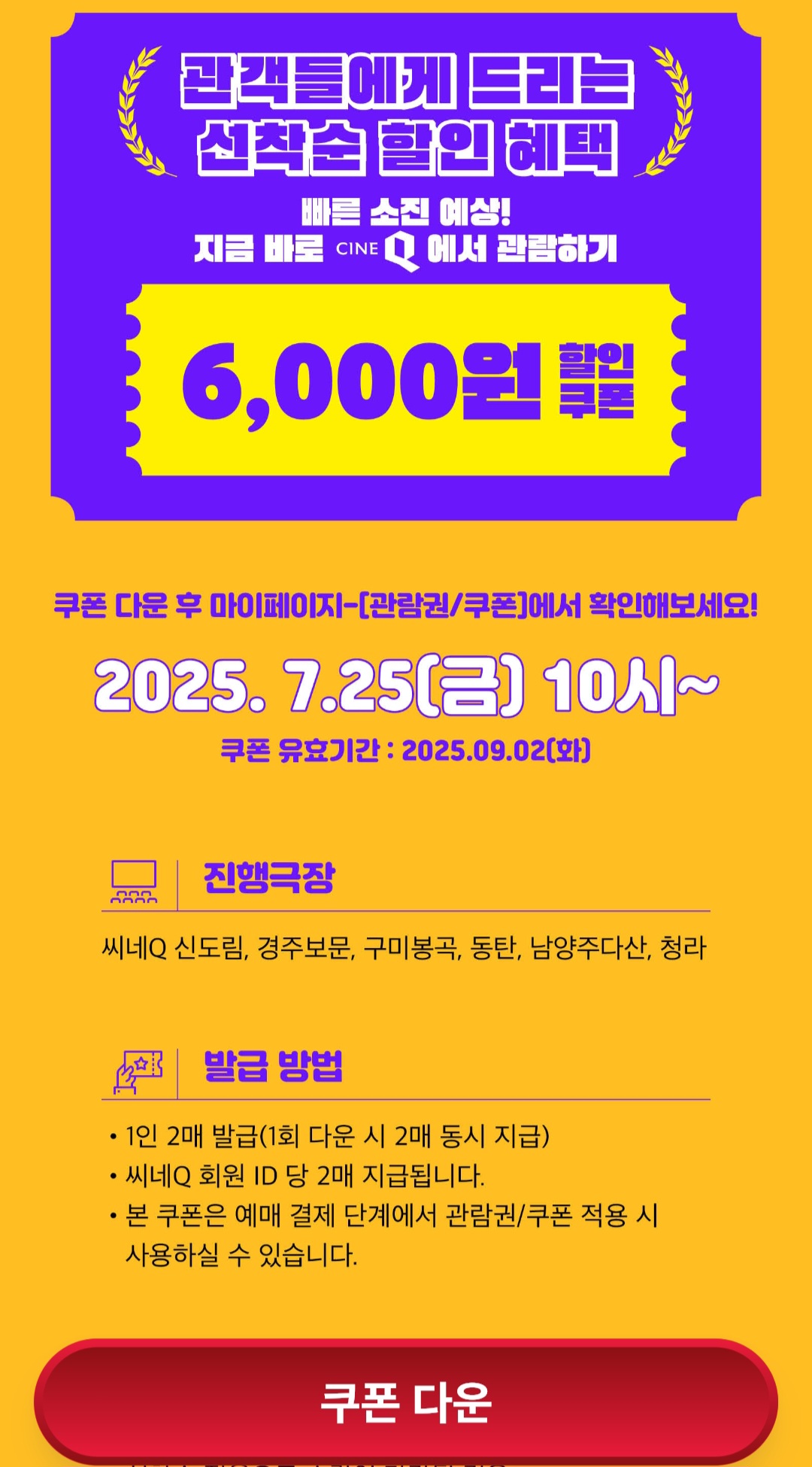 - 25일 오전 10시부터 시작, CGV·롯데시네마·메가박스·씨네큐 등 주요 멀티플렉스 영화관 홈페이지 및 모바일 앱에서 선착순 다운로드 가능