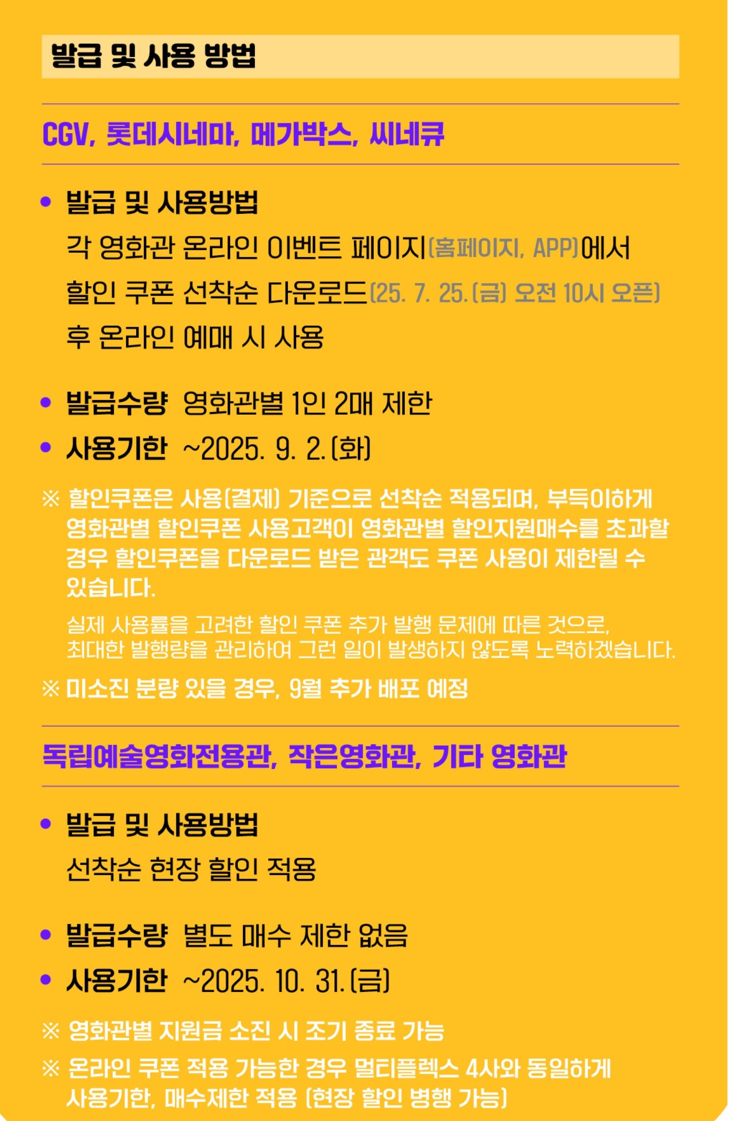 - 현장 발급 및 예매 방식 제한이 있을 수 있으므로 사전에 해당 영화관에 확인 권장.