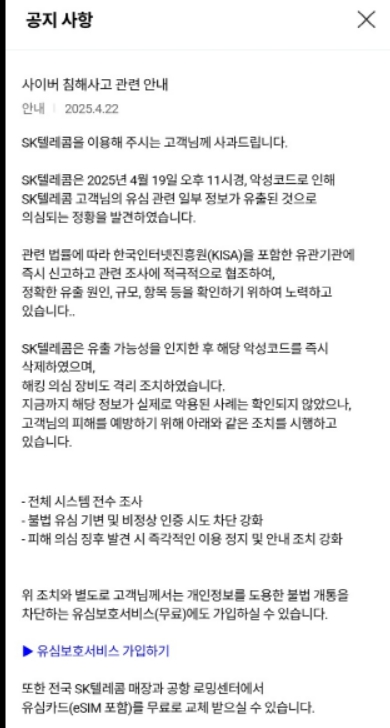 SK텔레콤 고객이신 분께서는 유심 무료 교체와 유심보호서비스 가입을 통해 개인정보를 보호하시기 바랍니다.