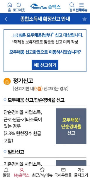 국세청 보유자료로 맞춤형 신고 or 정기신고 내용 중 본인에게 맞는 신고 버튼 클릭하기