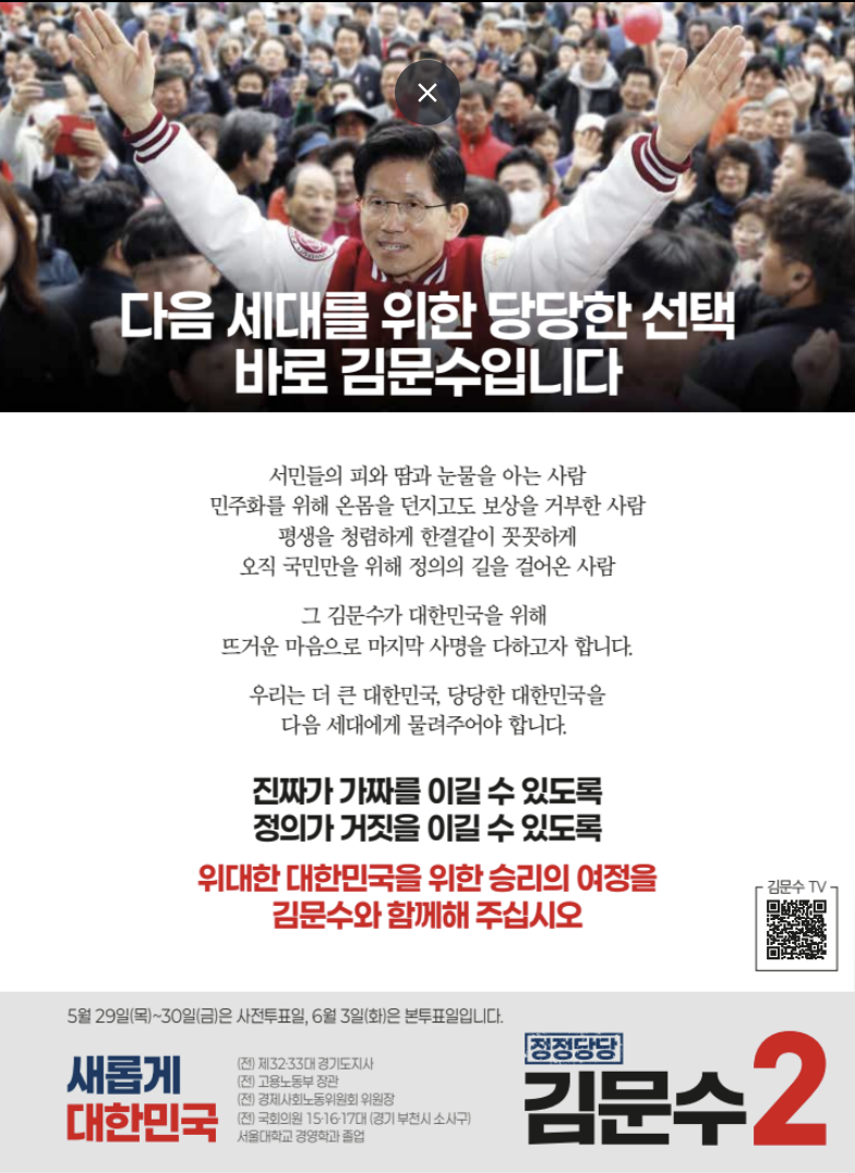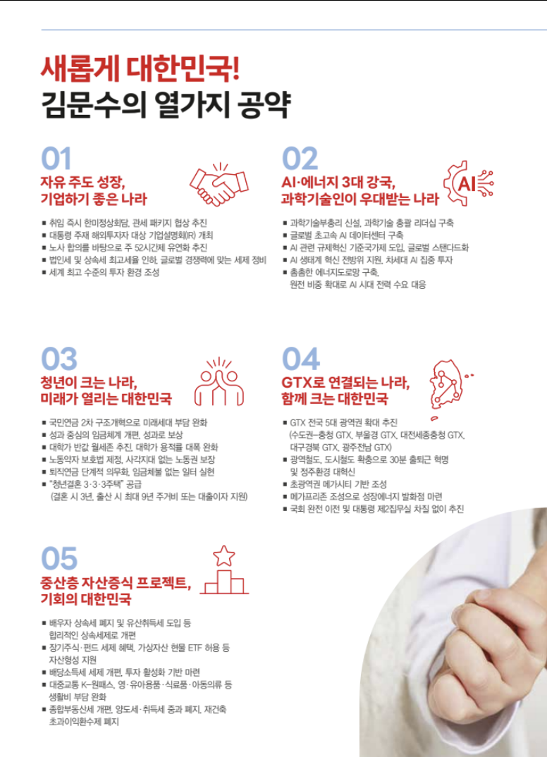 유권자 여러분께서는 김문수 후보의 공약을 꼼꼼히 살펴보시고, 향후 대한민국의 방향성을 결정하는 데 참고하시기 바랍니다.