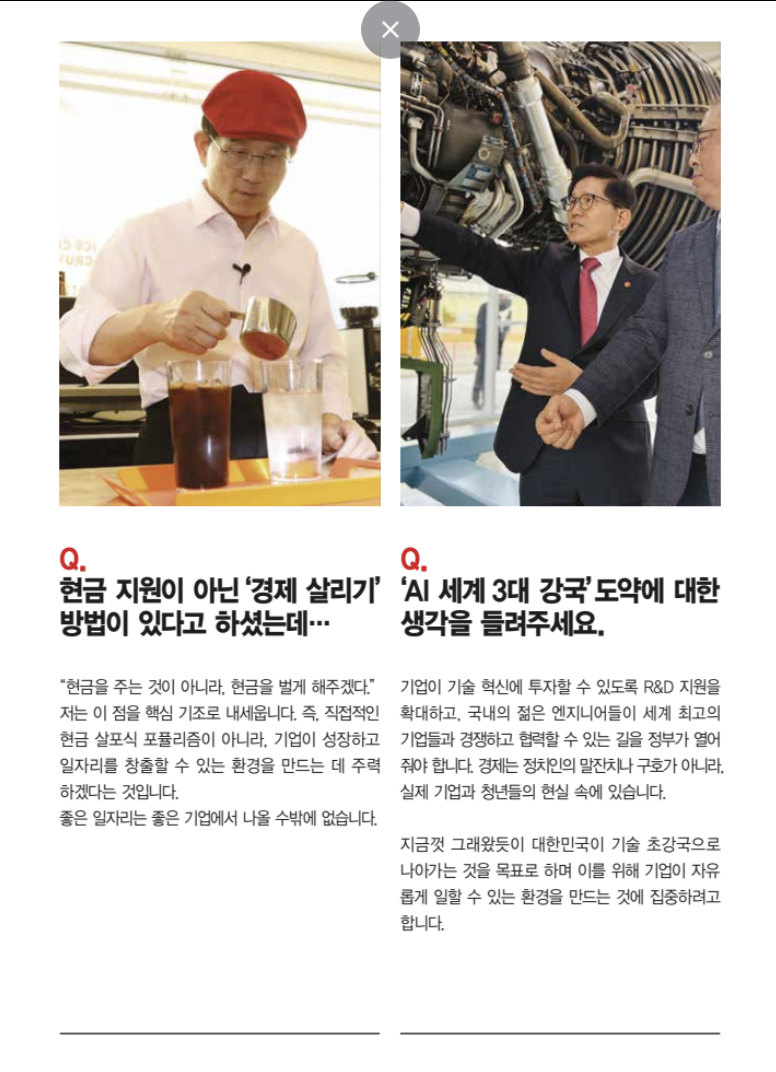 - 기업하기 좋은 환경 조성: 규제 완화를 통해 기업의 자율성을 보장하고, 신산업·신기술 분야의 성장을 지원하겠다는 계획을 발표했습니다.