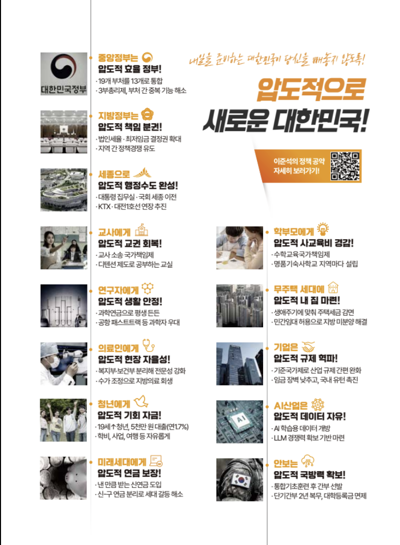 그의 공약은 청년층과 중도층의 지지를 얻기 위한 실질적인 정책들로 구성되어 있으며, 행정의 효율성과 지방분권을 강조하고 있습니다. 유권자 여러분께서는 이준석 후보의 공약을 꼼꼼히 살펴보시고, 향후 대한민국의 방향성을 결정하는 데 참고하시기 바랍니다.