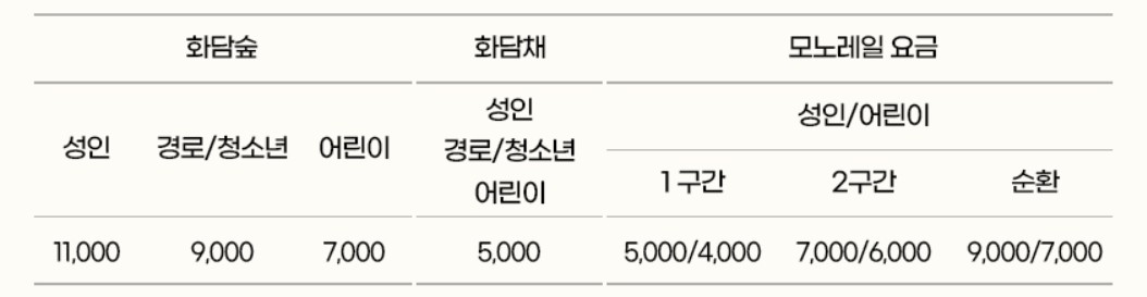 - 화담채 및 모노레일을 구매하기 위해서는 화담숲 입장권을 먼저 선택해 주세요.