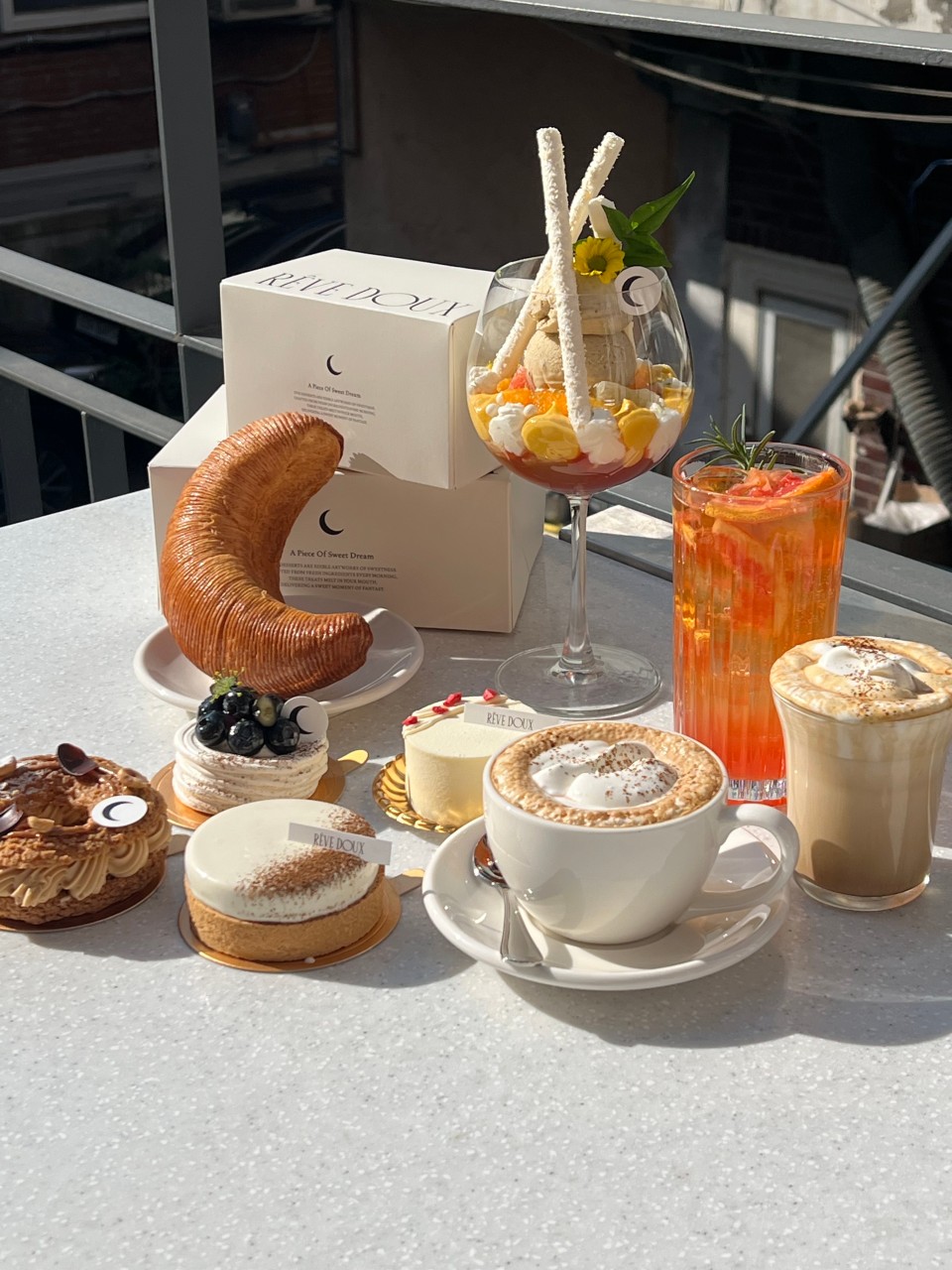 크루아상을 중심으로 타르트, 쁘띠갸또, 파르페 등 다양한 디저트가 진열되어 있으며,