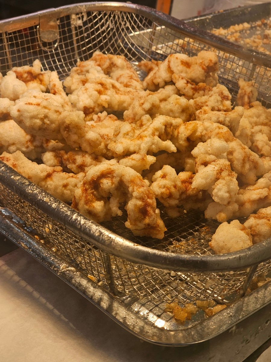 기름 온도를 일정하게 유지하며 두 번 튀기는 방식으로 겉은 바삭하고 속은 촉촉한 상태를 유지합니다.