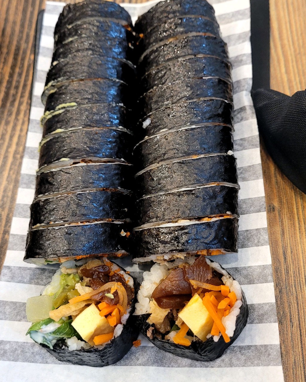 김밥을 반으로 잘랐을 때 속 재료가 흐트러지지 않고차분하게 정리된 모습이 눈에 들어왔습니다.