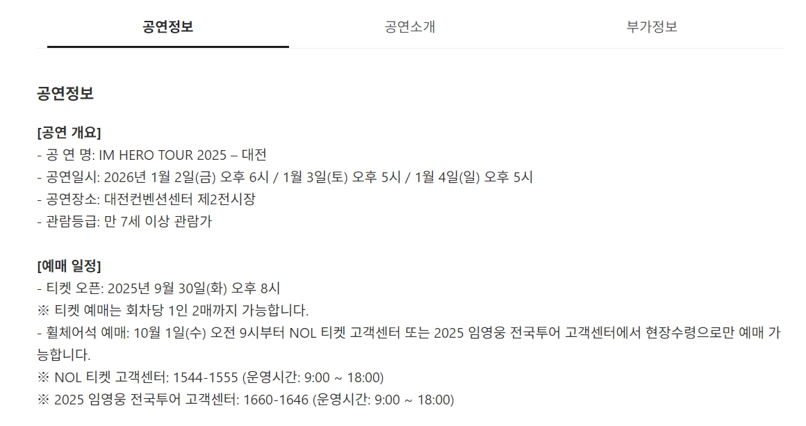 - 1인당 예매 매수 제한이 있으니 가족·지인 예매를 분담할 때는 계정별로 진행 (회차당 1인 2매)
