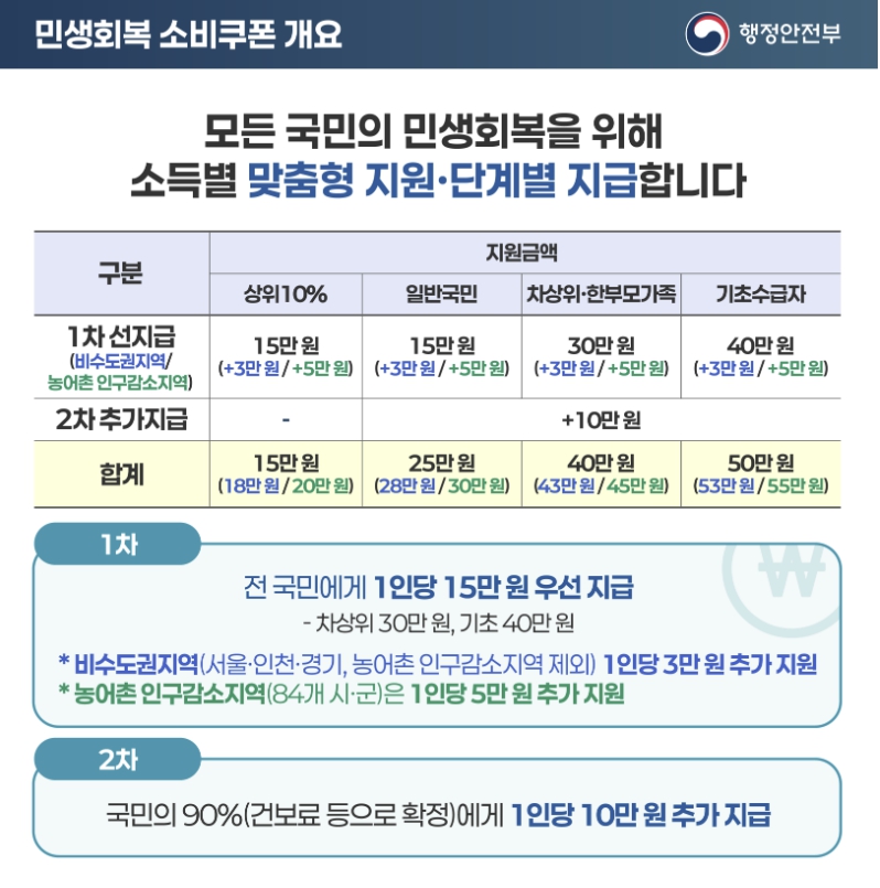 2025년 정부는 민생회복 소비쿠폰과 민생회복지원금을 통해 고물가·코로나 이후 침체된 경기를 회복하고 국민들의 소비 여력을 강화하기 위한 정책을 추진 중입니다. 이번 제도는 전 국민 대상