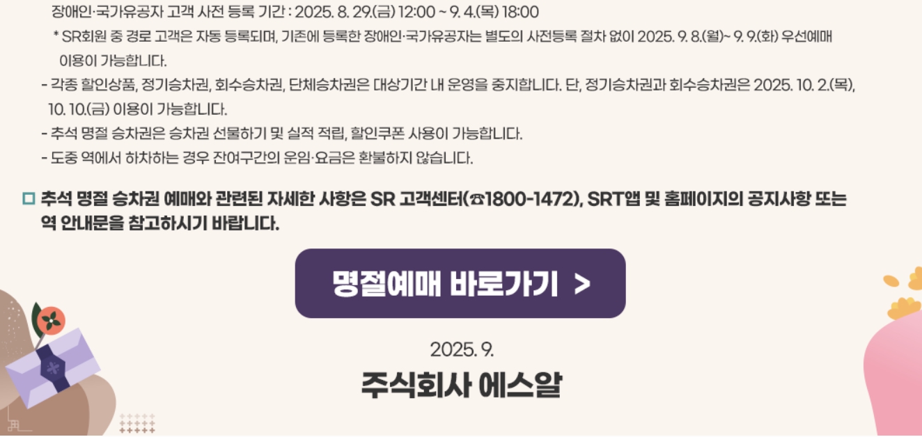 - 9월 11일(목) 15시부터 srt 앱, 홈페이지, 역 창구등 에서 상시 구매가능