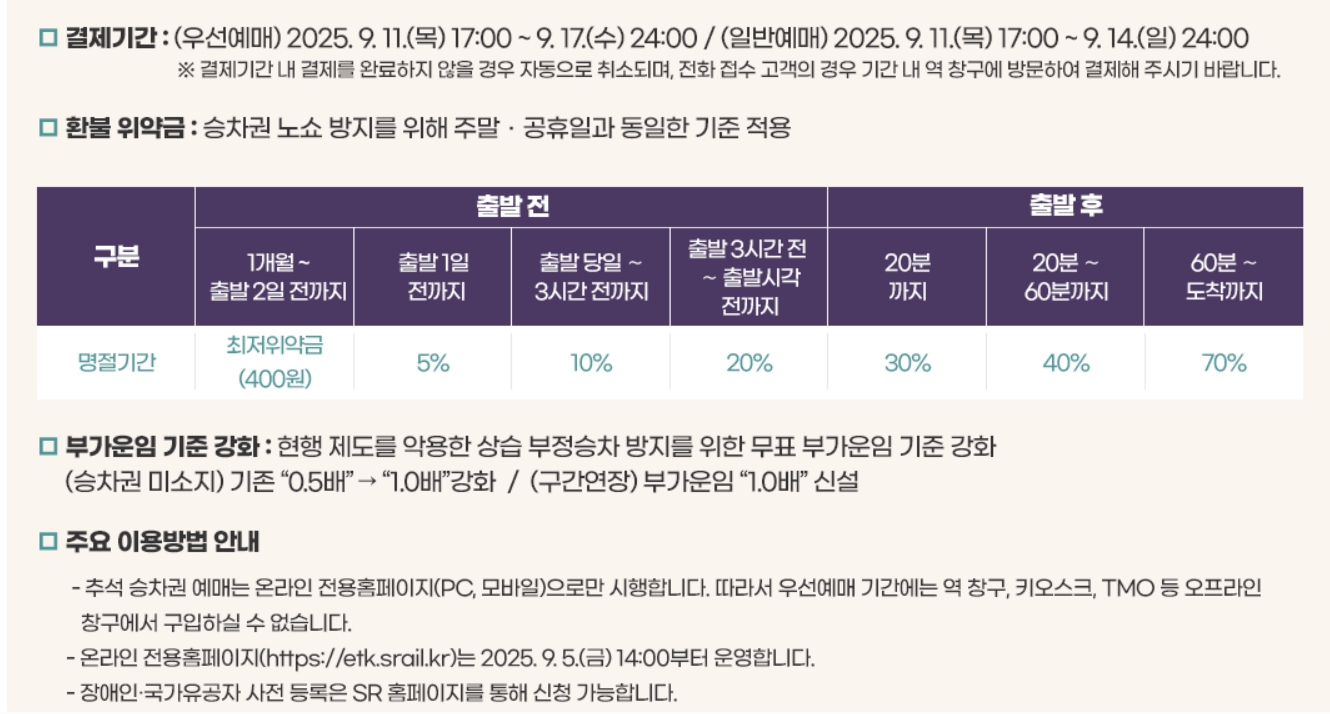 - 9월 18일(목) 15시부터 코레일톡, 홈페이지, 역 창구에서 상시 판매